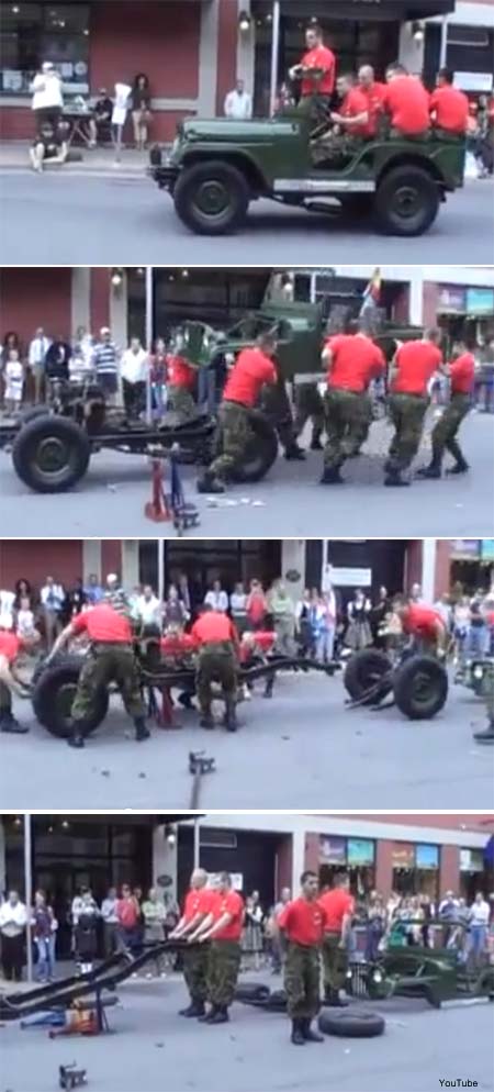 약 4분 동안의 시간에 군용 자동차를 해체하고 다시 조립하는 군인들이 나오는 영상이 인기를 끌고 있다. 군인 특유의 절도 있는 동작으로 자동차 해체 조립 묘기를 선보인 이들은 캐나다 군인들인데, 국민을 위한 군대 행사의 일환으로 이와 같은 깜짝 이벤트를 벌인 것으로 전해진다.