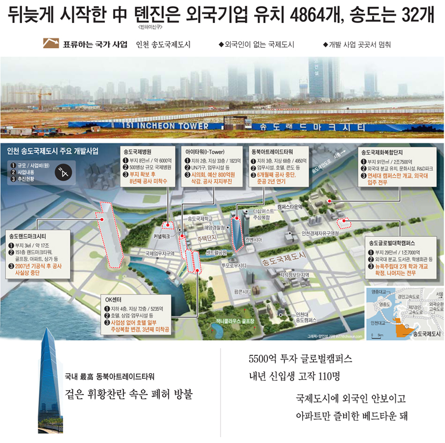 정부는 2003년 8월 송도를 경제자유구역으로 지정하면서 대대적인 투자에 나서 지금까지 30조원에 육박하는 돈을 쏟아부었다. 하지만 현재 송도에 들어온 외국 기업은 25개. 연구소까지 포함하면 32개다. 그나마 한국 기업에 일부 지분 투자를 한 것이 대부분이다. 학교나 병원은 아예 없다. '국제도시'에서 '국제'는 간 곳 없고, 아파트만 즐비한 베드타운으로 전락했다.