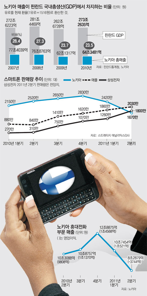 정보기술(IT)의 큰 변화에 전략적으로 대처하지 못한 노키아의 추락은 여러모로 시사점을 안겨준다. 한 기업의 몰락이 국가 경제에 커다란 영향을 미치기 때문이다. 노키아의 매출액이 핀란드 국내총생산(GDP)에서 차지하는 비중은 2007년 28.4%에서 23.5%로 줄었다. 국가 경제의 큰 몫을 차지한 노키아가 흔들리면서 핀란드 경제 전체까지 휘청거리는 상황이다.