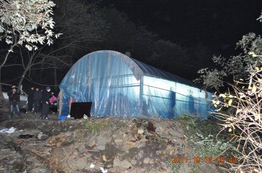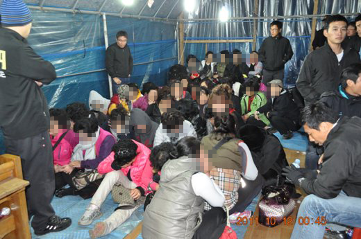 - ▲ 산속 천막 안에서 30여 명의 여성이 모여 화투패를 나눠 들고 속칭 ‘아도사끼 고스톱’을 벌이다 적발된 현장.