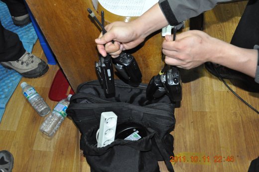 - ▲ ‘창고장’ 최모(53ㆍ여)씨 등 15명이 무전기를 들고 망을 보는 ‘문방’, 판돈을 배분하는 ‘상치기’,