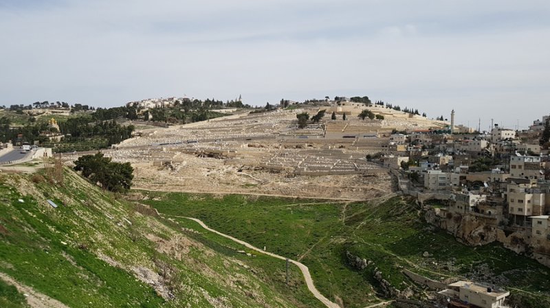 예루살렘 서쪽 산의 저 꼭대기에서부터 감란산 교회와 주기도문 교회와 눈물방울 교회가 있습니다.